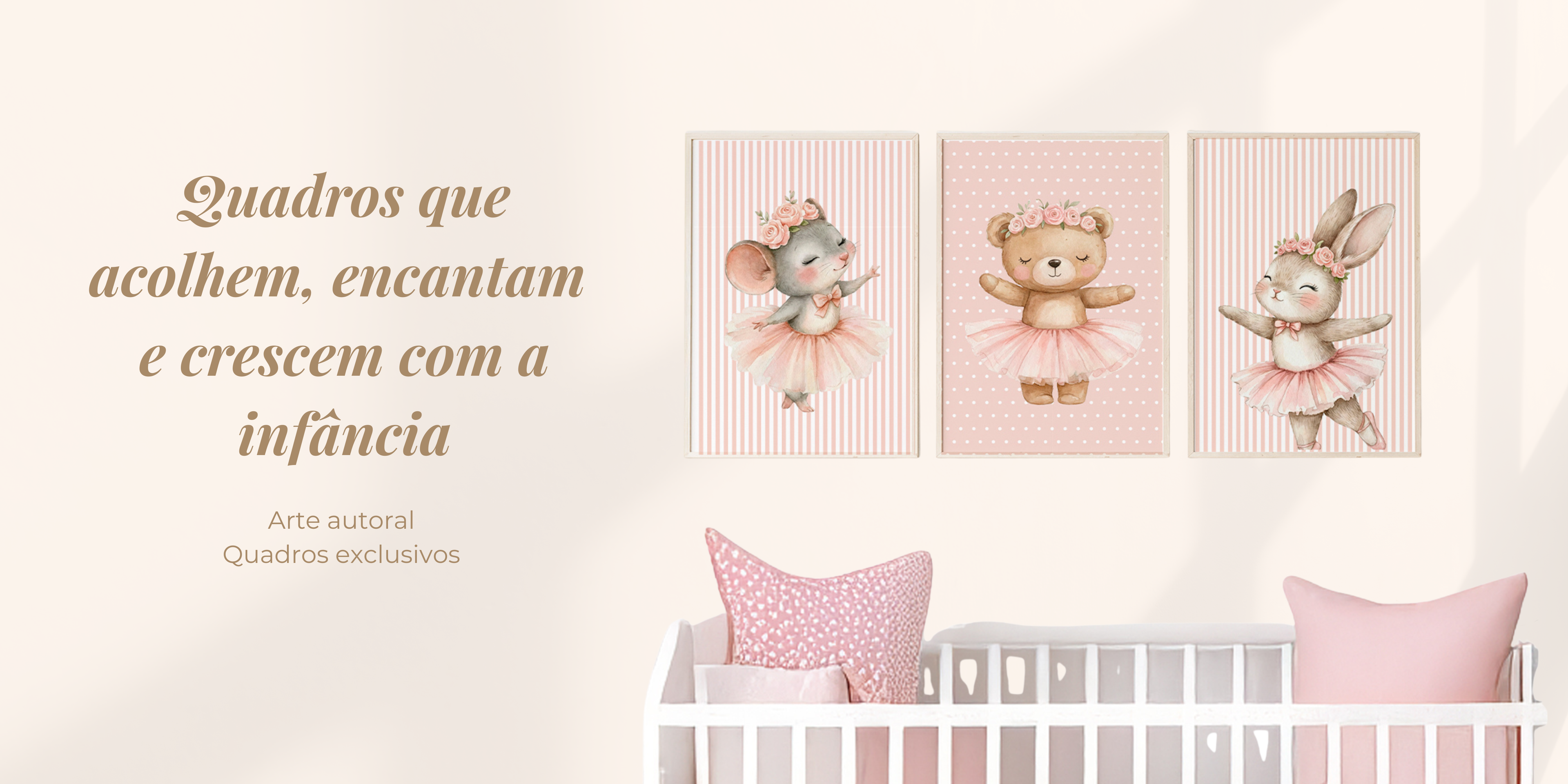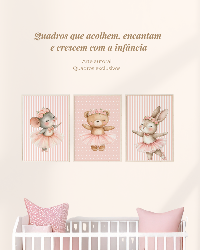 Kit 3 Quadros Infantil Quarto Bebê Meninas Bailarinas Ursinha Ratinha e Coelhinha