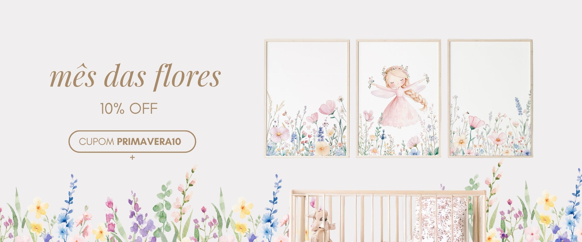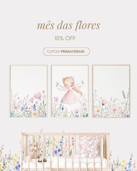 Kit 3 Quadros Infantil Quarto Bebê Menina - Jardim das Fadas - Fadinha Morena
