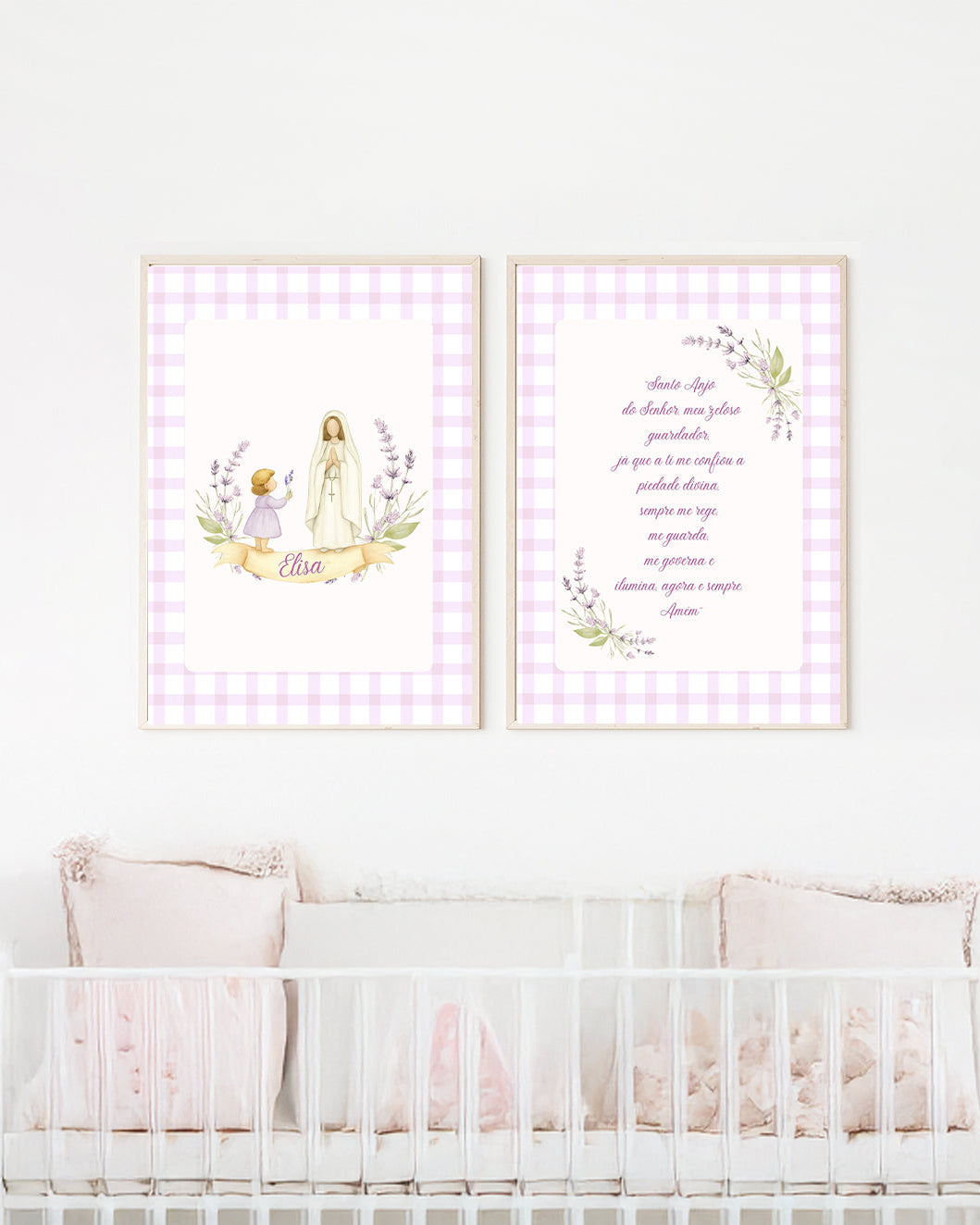 Kit 2 Quadros Quarto Bebê Menina Lilás Nossa Senhora + Oração Santo Anjo Personalizado com Nome