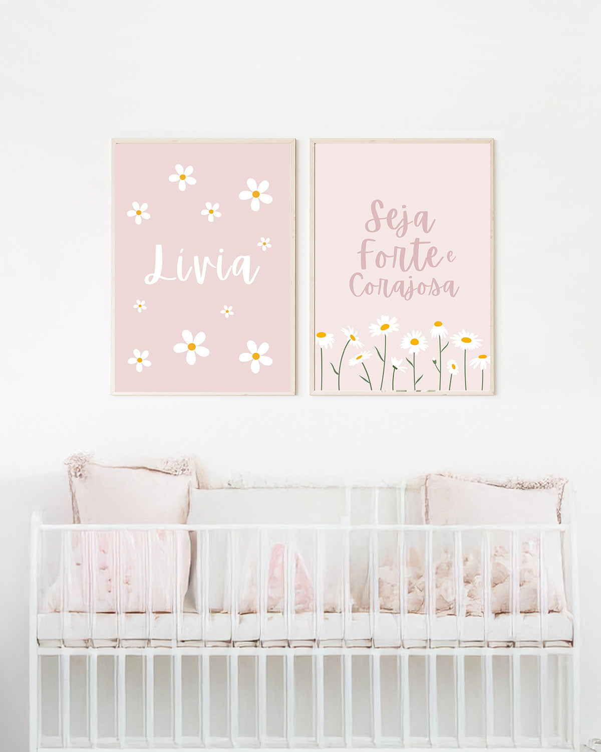 Kit 2 Quadros Quarto Bebê Menina Rosa Margaridas Personalizado Nome - Seja Forte e Corajosa