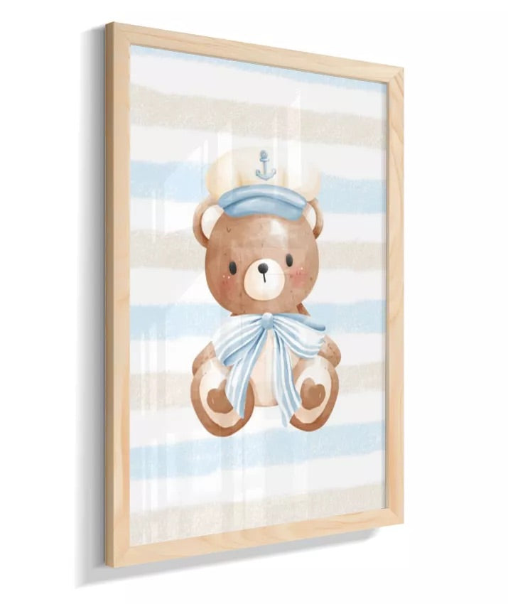 Conjunto de três quadros decorativos que elevam a estética do quarto infantil com refinamento. Apresenta ilustrações de ursinho em temática marinha, com paleta de cores delicadas e equilibradas. Personalizável com o nome e inicial do pequeno, agregando um caráter exclusivo ao ambiente. A composição em trio cria uma narrativa visual coerente na parede, proporcionando profundidade e sofisticação ao espaço. Ideal para pais que buscam decoração de qualidade, funcional e memorável para o quarto do bebê.