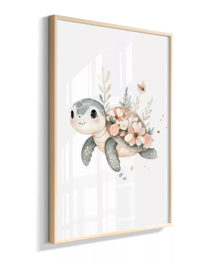 Todos os nossos quadros acompanham vidro acrílico cristal — um material leve, lindo e perfeito para quartos infantis, que não estilhaça.