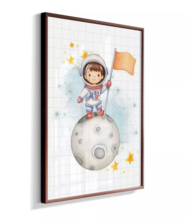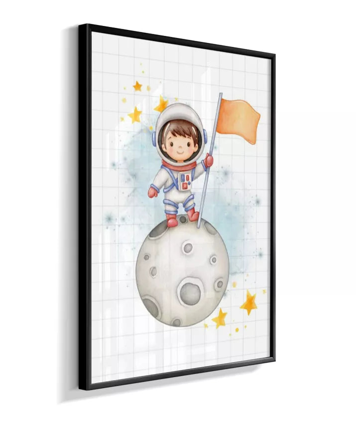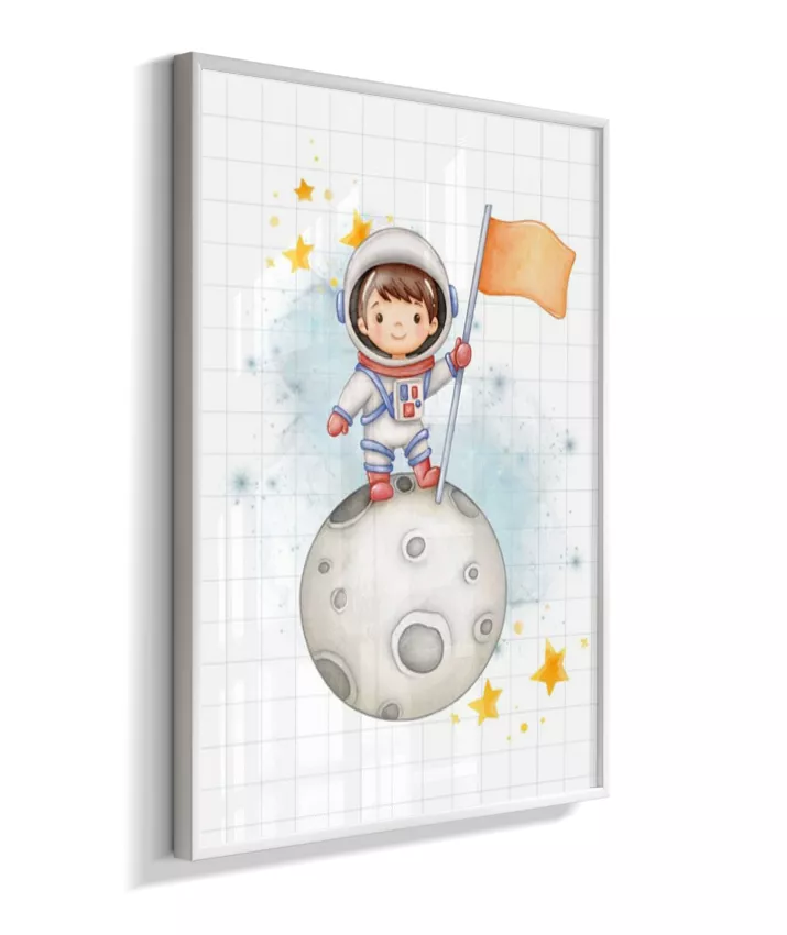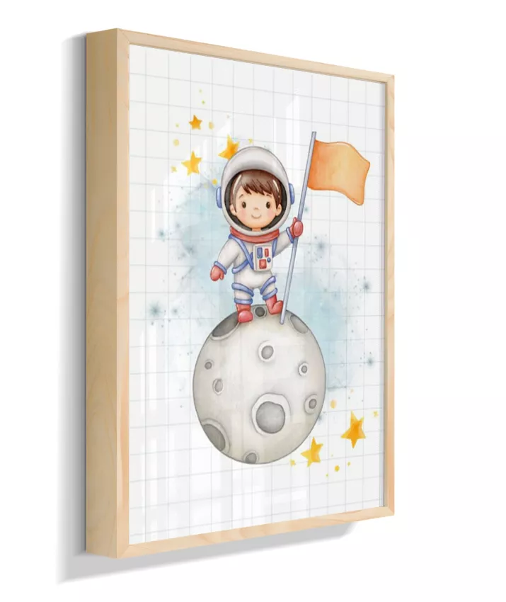 Todos os nossos quadros acompanham vidro acrílico cristal — um material leve, lindo e perfeito para quartos infantis, que não estilhaça.